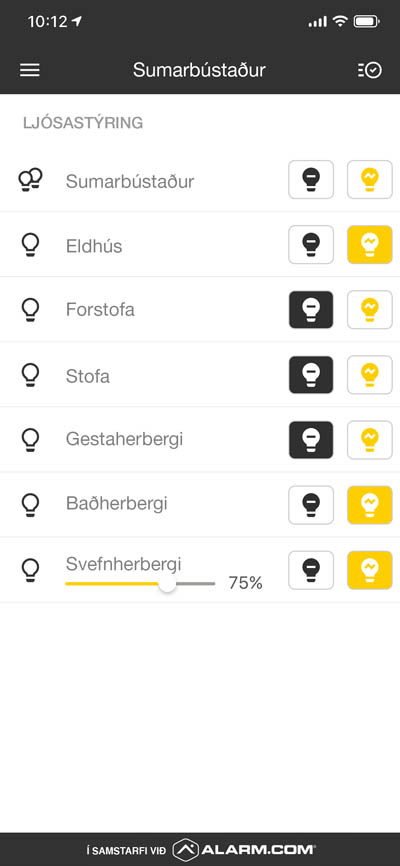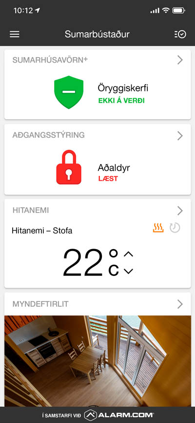 Með appinu getur þú fylgst með sumarhúsinu og stjórnað öryggiskerfinu og snjallbúnaði ásamt því að kveikja og slökkva á ýmsum raftækjum eða stýra notkun þeirra með snjalltengjum.
